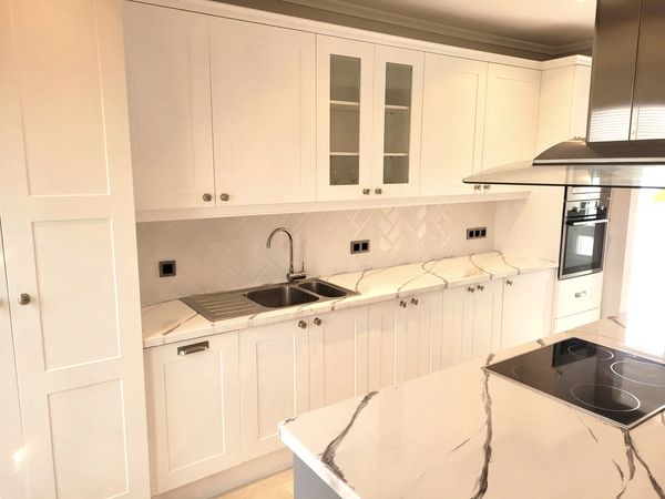 We collect your kitchen doors/drawer fronts on the first day and take them back to our workshop where the most important step of cleaning and sanding both sides takes place.If the laminate is blown or peeling then this will be removed and the doors are then primed both sides and all imperfections are sorted out.